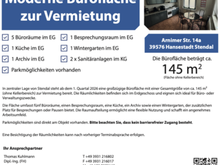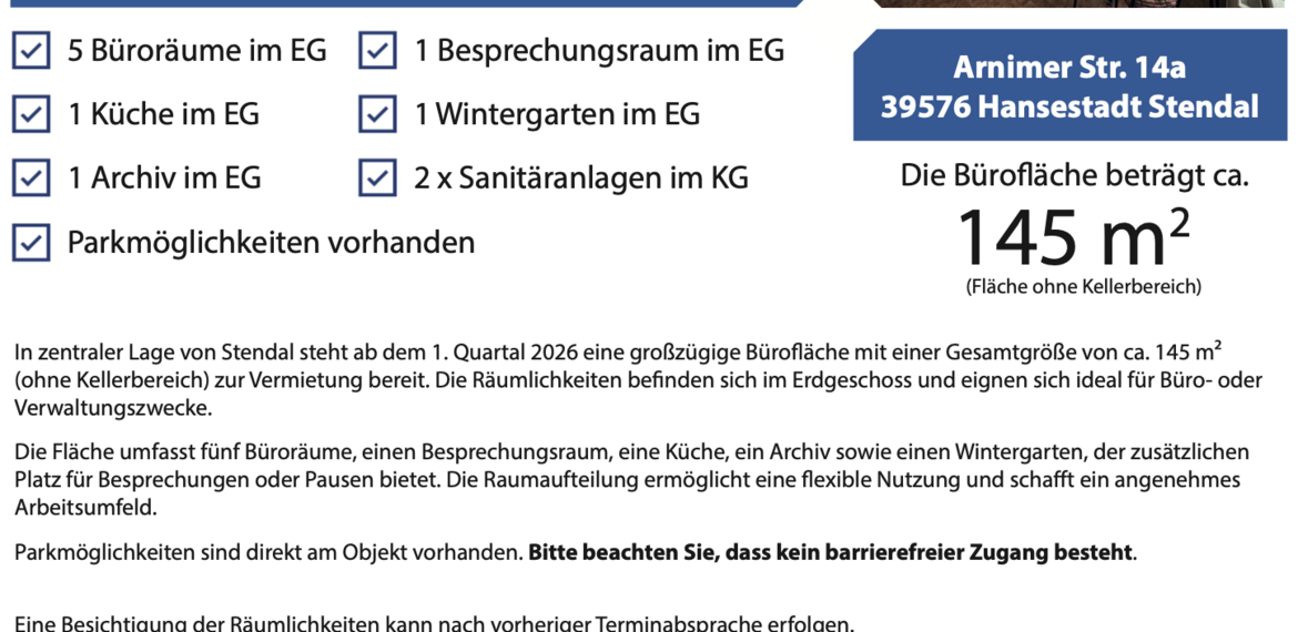 In zentraler Lage von Stendal steht ab dem 1. Quartal 2026 eine großzügige Bürofläche mit einer Gesamtgröße von ca. 145 m²